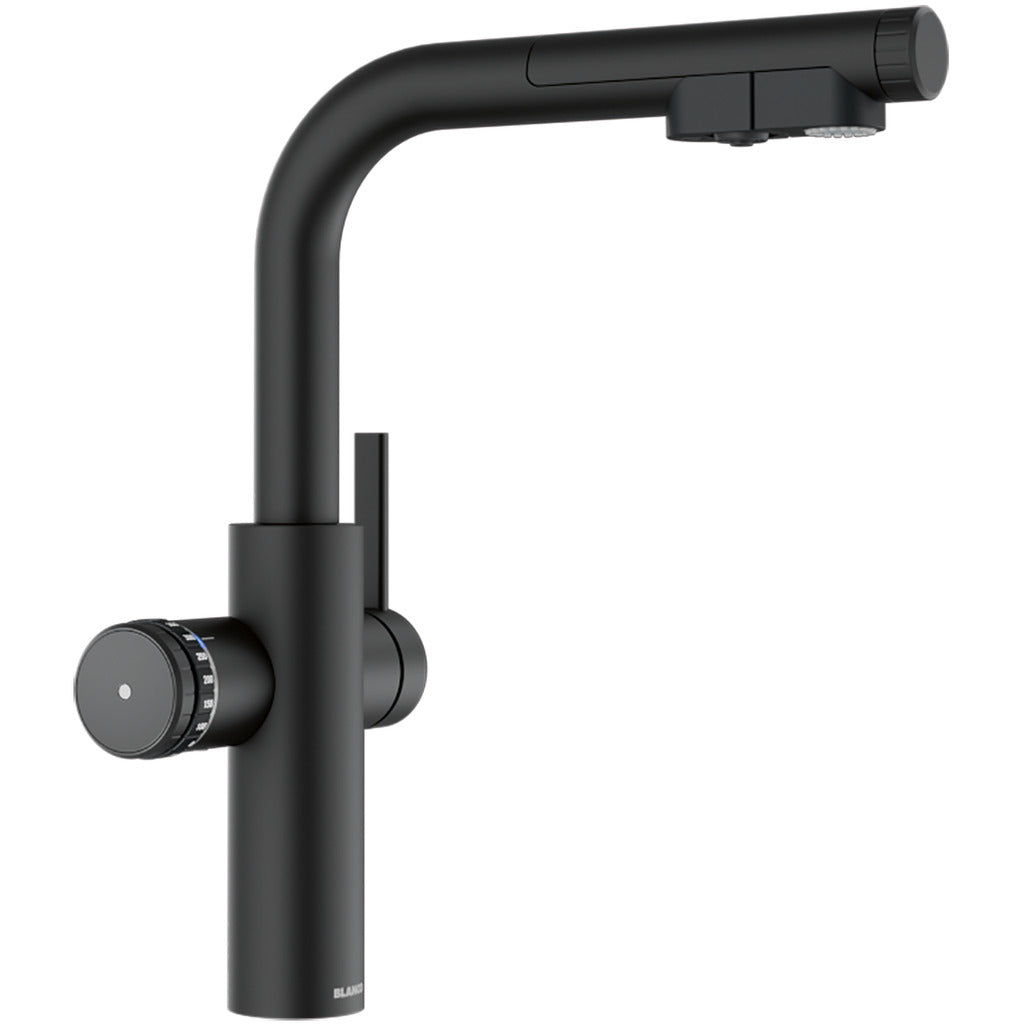 - Gourmet-Wasser: Die Armatur liefert gefiltertes Wasser – gekühlt, sprudelnd (still, medium, classic) oder kochend heiß – zusätzlich zu normalem Kalt- und Warmwasser