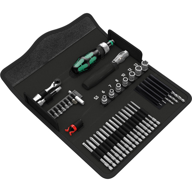 Compact tool set with the 41 most important screwdriving tools for wood construction; with the robust Zyklop Mini bit ratchet including extension and socket adapter; 8 hand and power sockets sizes 5.5-13; 1 ratchet hand holder 816 RA with ratchet function, fine toothing for a small return angle, reversing ring (right, fixed, left), maximum torque 50 Nm, and bit holder with Rapidaptor technology; 1 universal bit holder; 6 bits with a length of 25 mm; 16 bits with a length of 89 mm; 5 wood twist drill bits with a diameter of 3-8 mm; 1 screw claw for holding screws; 1 voltage tester 247