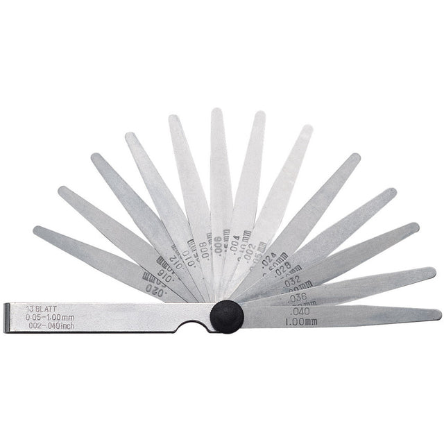 Blades made of hardened spring steel, individually labeled, tapered, nickel-plated shell, with locking screw. For checking gaps, contact distances, etc. Blade length 100 mm.