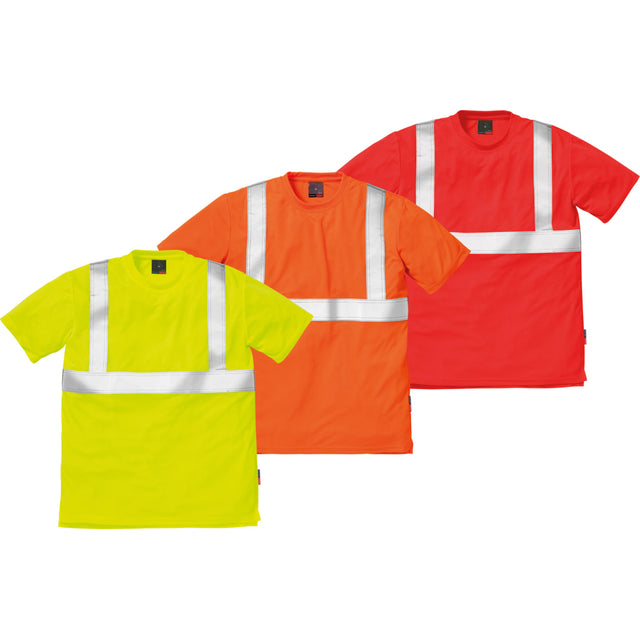 Maglietta ad alta visibilità con scollo tondo, adatta al lavaggio industriale.