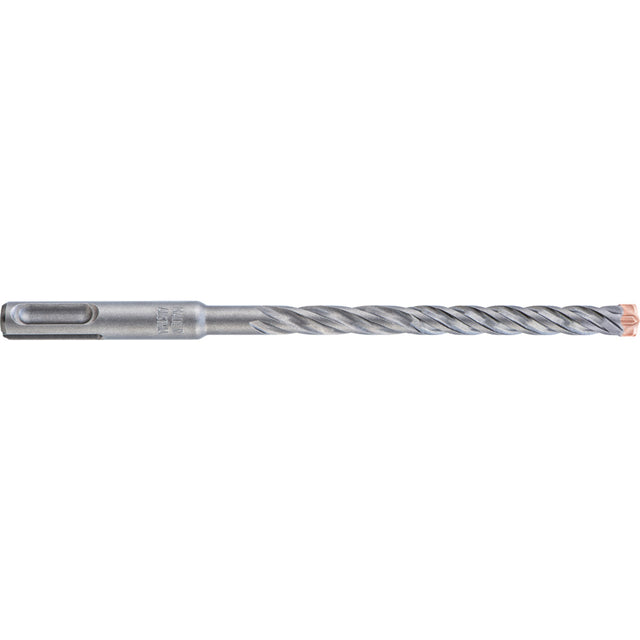 SDS-plus Hochleistungsbohrer mit 4 Vollhartmetall-Schneiden und neuem, progressivem Spiralendesign mit Dübellängenindikator. Problemloses Durchbohren von Eisenarmierungen, vibrationsarmer Lauf und schnelle Bohrmehlförderung.