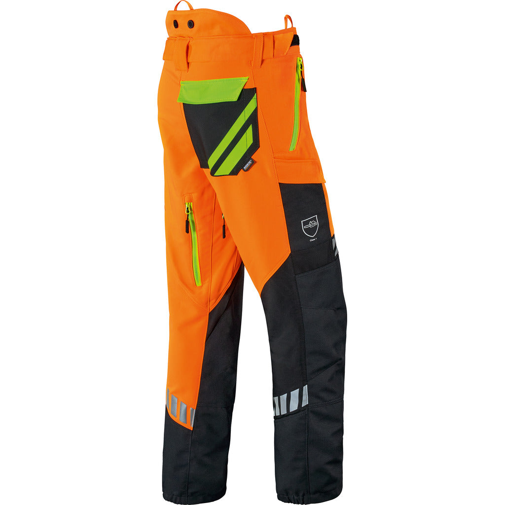- Il mix di materiali funzionali costituito da un robusto tessuto esterno nella parte anteriore e da un materiale elasticizzato altamente elastico nella parte posteriore, nonché da un inserto ProElast altamente flessibile nella zona del cavallo e dal collegamento elastico della protezione antitaglio sul tessuto esterno dei pantaloni, offre ampia libertà di movimento.