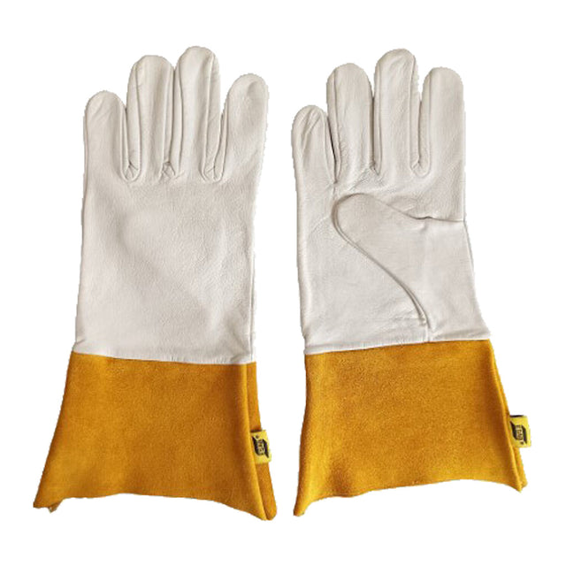- eine breite, strapazierfähige Spaltlederstulpe hält Spritzer vom Handgelenk fern und deckt den Spalt zwischen Hand und Schweißerjacke ab